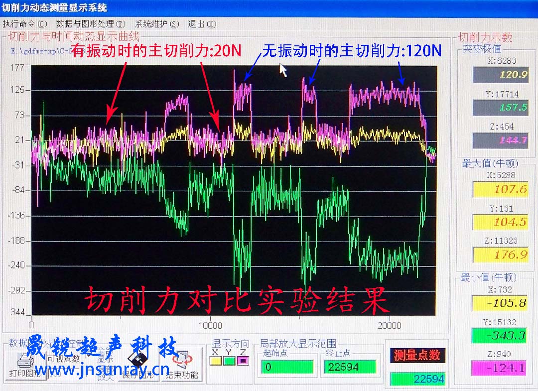 从切削力测量系统的测量结果来看,超声振动切削的切削力约为普通切削的六分之一!