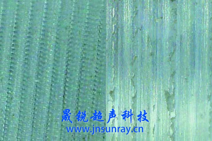 图中左侧为超声振动切削的工件表面显微照片,右图为普通精车加工后的工件表面显微照片。